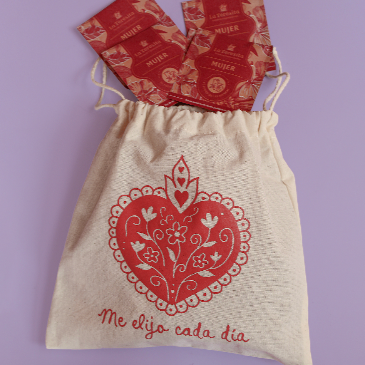 Una invitación a regalarte un momento para ti. Esta bolsita de tela con diseño de corazón rojo contiene 45 sobres de Infusión Mujer, una mezcla herbal creada para acompañarte con bienestar, equilibrio y pequeños rituales de autocuidado.