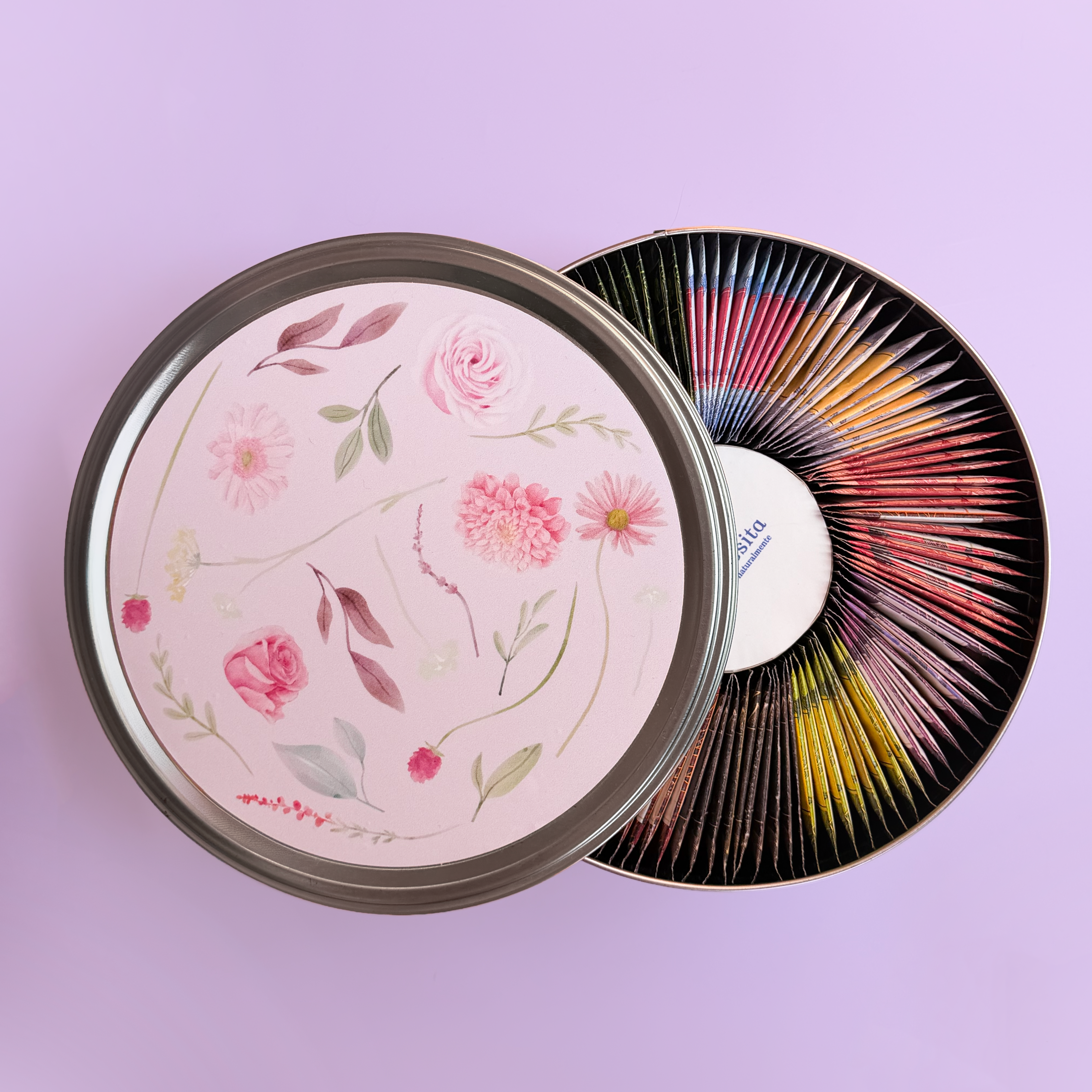 Llega a La Teresita Amor natural, una caja redonda metálica que contiene 120 infusiones surtidas, con un diseño especial de flores y rosas.