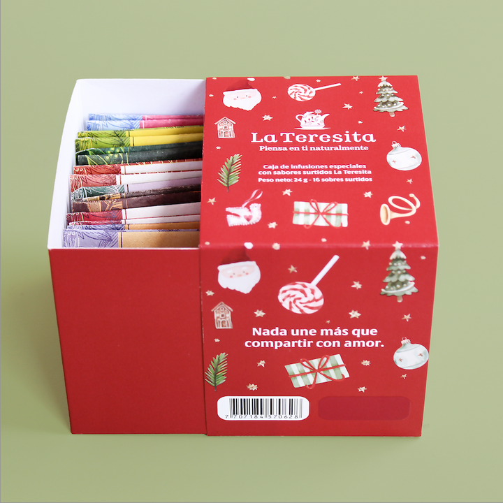 Contiene 16 infusiones surtidas que inspiran bienestar, pausa y la magia de celebrar con amor.
