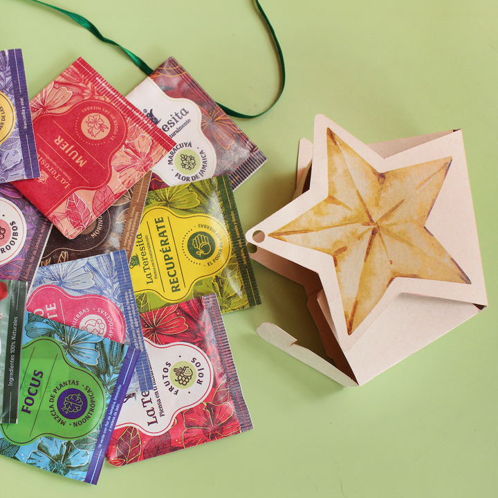 Pequeños detalles con forma de ornamento navideño, cada uno con 10 infusiones surtidas.